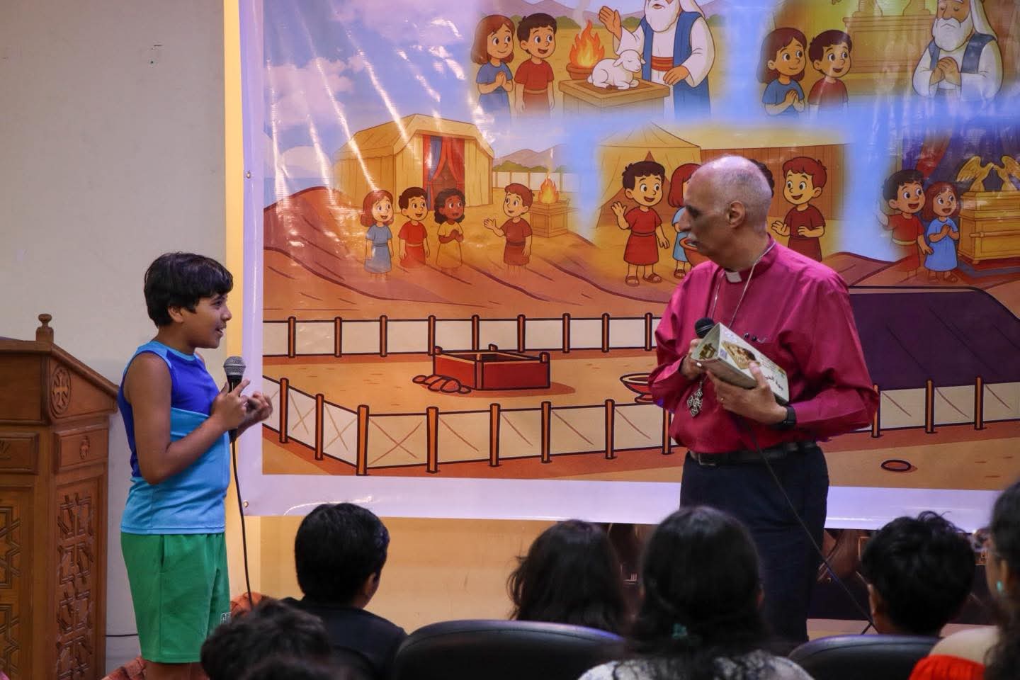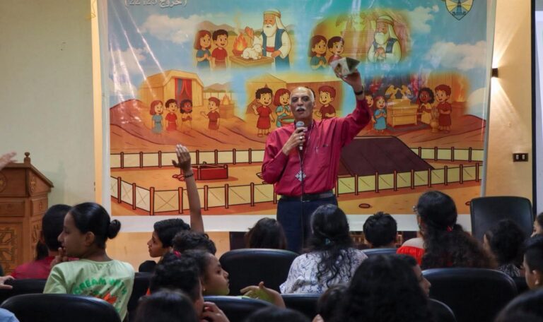 Archbishop Dr. Samy Fawzy, Archbishop of the Anglican Province of Alexandria, visited the Sunday School Conference organized by the diocese under the theme “Inside the Tent” (Exodus 25:22). The four-day conference was attended by Rev. Yeshua Bakhit, the conference pastor; Eng. Manal Mansi, Head of the Diocesan Childhood Committee; and Eng. Andrew Aoun Allah, the conference leader.
